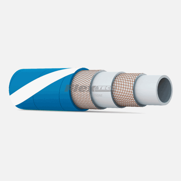 The ultimate washdown hose. This is an FDA washdown delivery hose for potable hot water mixed with steam and detergents. T5720 is constructed from a white, smooth, food quality EPDM rubber compound liner which is reinforced with high strength synthetic plies and covered with a blue, smooth, cloth impression EPDM rubber compound that is abrasion and weather resistant.